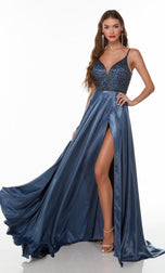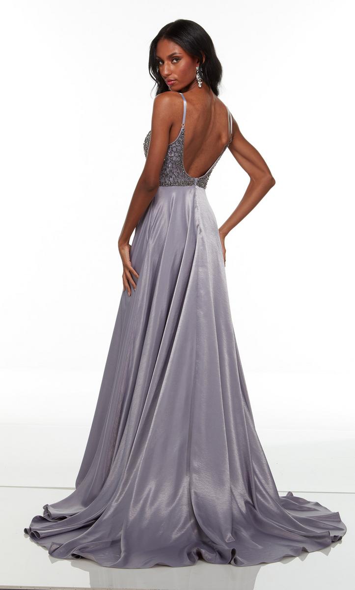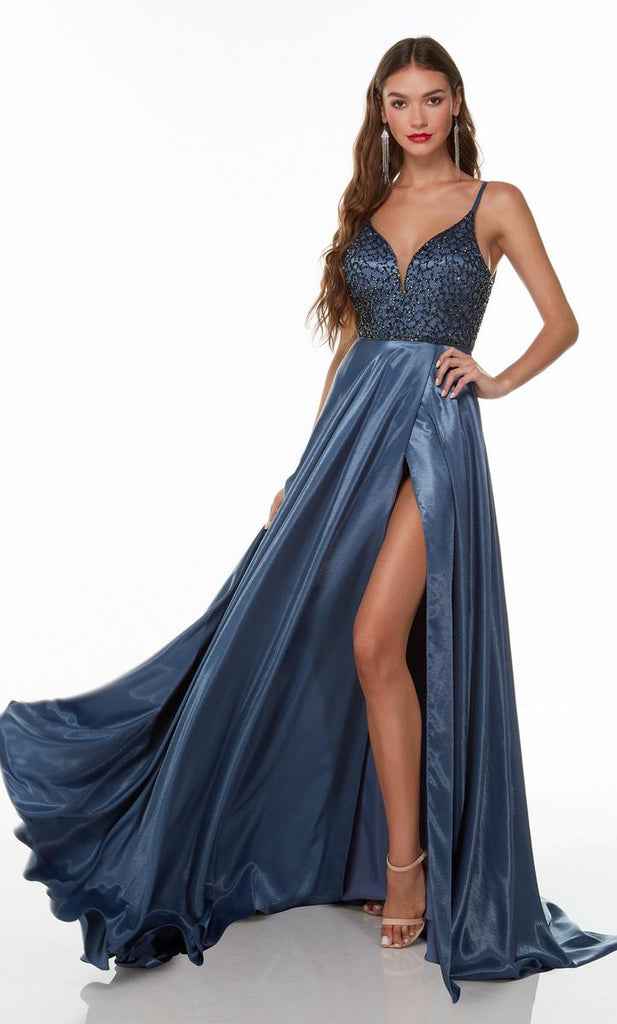 feel untouchable in this gorgeous long aline gown designed by Alyce Paris Prom. 61197, showcases a modest v-neckline, thin satin straps and scoop back. The fitted top is fully embellished in dazzling beading. A flowy satin skirt with a sweep train. Perfect for any special occasion!