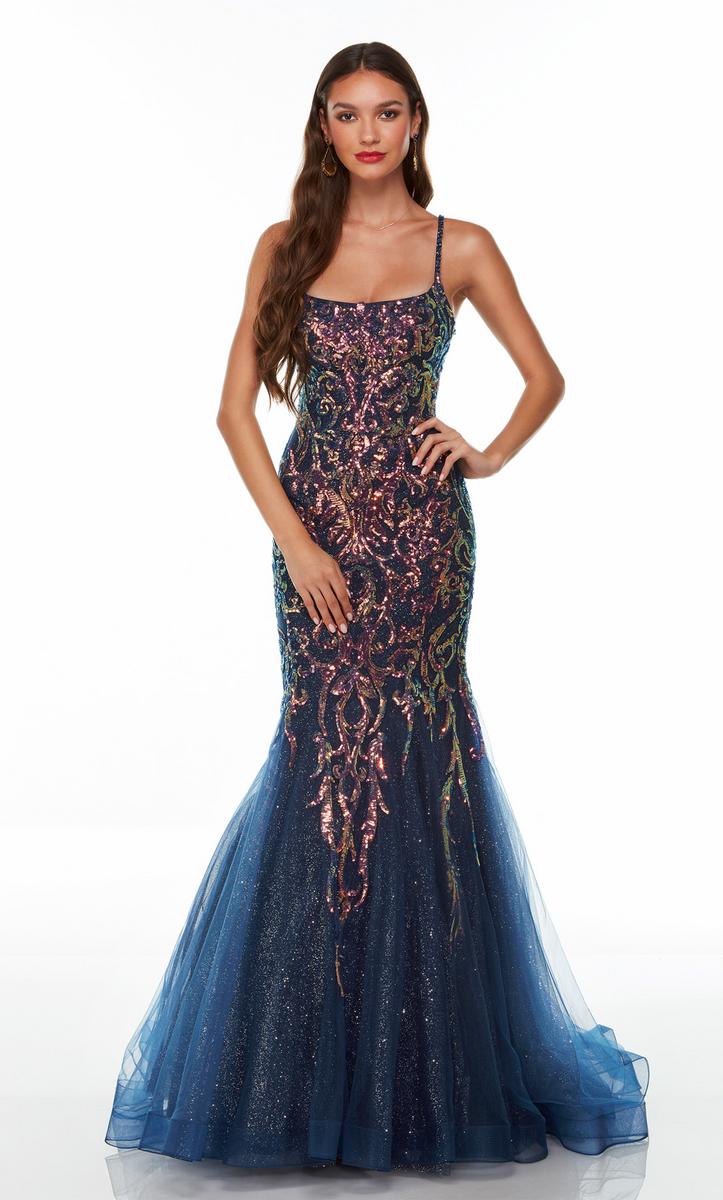 Show off your figure in this formal mermaid gown designed by Alyce Paris,61204. The fitted silhouette is fully embellished with iridescent sequins! A square neckline, thin spaghetti straps that form into an open strappy lace-up back! A beautiful tulle sweep train that will follow every step that you take, making it the perfect gown for you.