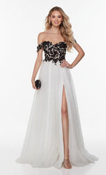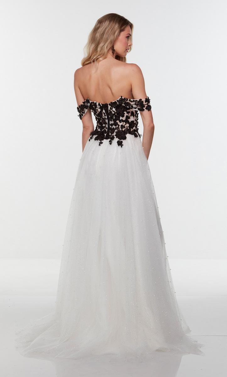 Embrace your uniqueness in this long Aline gown designed by Alyce Paris, 61219. The classy gown showcases a off-the-shoulder sweetheart neckline with cap sleeves and zipper back. The fitted gown is adorned in delicate black floral lace on white tulle making it pop! A flowy glitter tulle skirt that will have you shining bright! A front leg slit and sweep train that will sway with every step that you take!