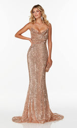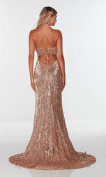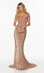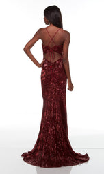 Feel the glam in this stunning long form fitting gown designed from Alyce Paris, 61232. The fitted gown will flatter your figure just right and is embellished in dazzling sequins. The straight across neckline with thin straps that form into an open lace-up back. a sweep train finishes this lovely gown!