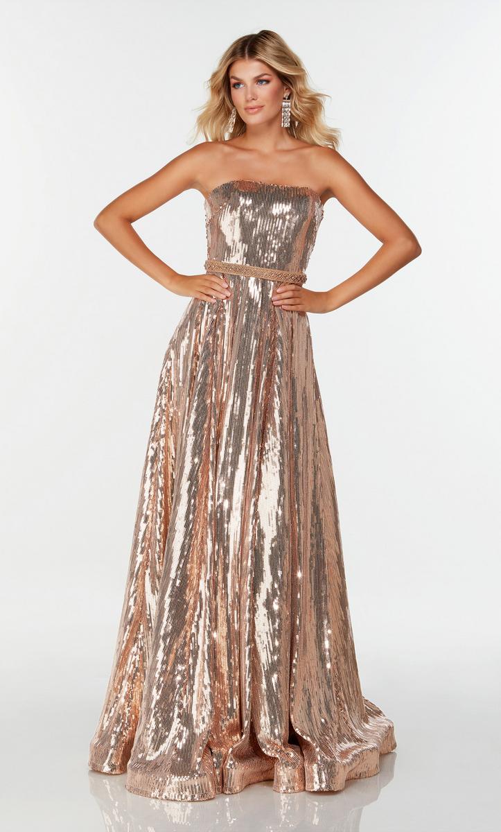 You were born to SHINE in this long sequin strapless prom dress by Alyce! 61233, showcases a strapless scoop neckline with zipper closure, a solid belt to accentuate your waistline and flowy skirt finished with horsehair edging! Perfect for Senior Prom!
