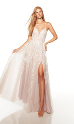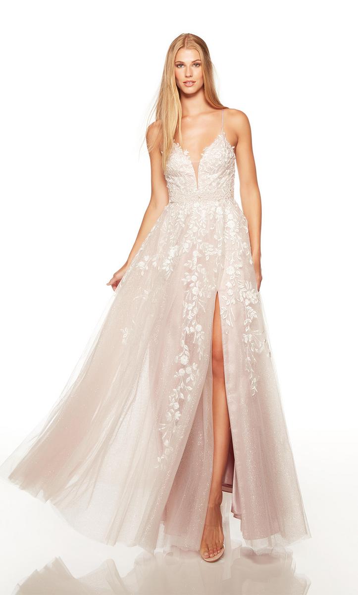 This Aline gown is pure elegance and designed by Alyce Paris from Spring 2023 Collection. 61312, has a v neckline, thin straps, open lace-up and fitted bodice with lace. The tulle skirt will sway with every step that you take and sexy leg slit.