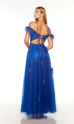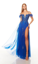 Say yes to the Prom dress at Terry Costa! This Alyce Paris gown, style 61323, is so fun and sassy to wear at any special event! The off-shoulder neckline has thin straps for extra support, a fun feather detail and plunging v neckline with mesh insert. The top is beautifully adorned with beaded lace detail and cascades onto the skirt. The tulle skirt is completed with a sexy leg slit and sweep train that will sway with every step that you take! The open back has a lace-up for easier adjusting and keyhole opening.