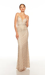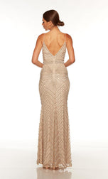 This Alyce Paris gown is perfect for all occasions and ages! 61351, is adorned with delicate hand sewn beading that will shine bright! The gown showcases a plunging v neckline with thin straps and low v back. A zipper back closure and light train. The gown will have all eyes on you once you enter the room!