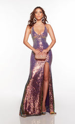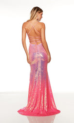 Prety in pink! This gown is absolutely breathtaking and created by Alyce Paris from Spring 2023. 61353, showcases a low neckline, straps that wrap around the neck and form into a crisscross open lace-up back. The gown is made with two-toned sequins and a sexy leg slit. This is perfect for Senior Prom and much more.