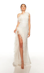 This gown is perfect for Senior Prom! 61370, has a super fun one-shoulder neckline with feather detail that runs through the zipper back. The fitted gown will give you the hourglass shape and is entirely adorned with sparkling bead work. The slit adds a sexy touch and sweep train that will sway with every step that you take!