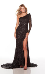 Sleeve are trending! So dont stay behind and grab this Alyce Paris gown, 61376, for any special event you have. The entire fitted gown is embellished with sparkling hand sewn bead detail that will shine from all angles, figure flattering silhouette and one shoulder that forms into a sleeve. The gown is completed with a side leg slit and lovely train that will sway with every step that you take. Perfect for all occasions!