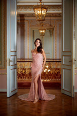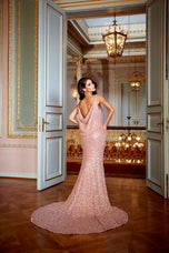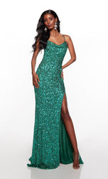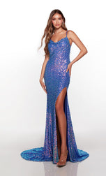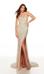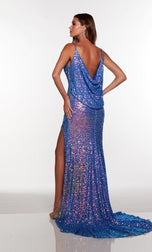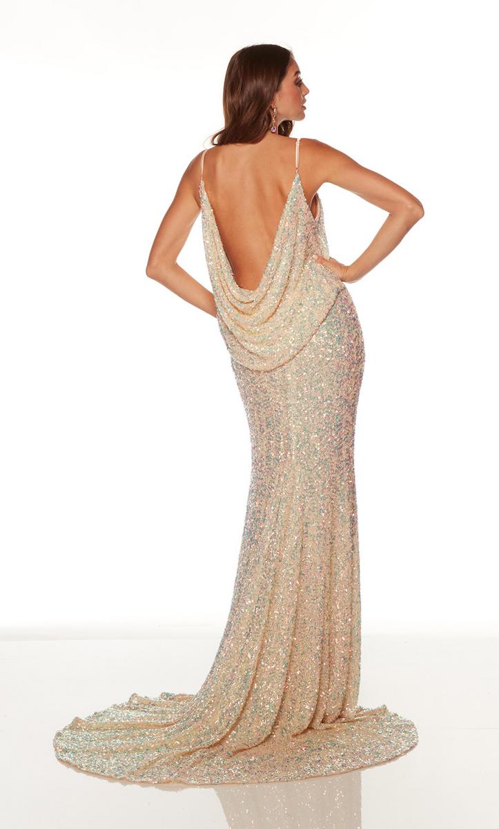 The Alyce Paris Spring 2023 Collection just keeps getting better and better!61390, is giving us the goddess vibes, we want! The scoop neckline has a light cowl front with fitted bodice that will show off your curves just right, and sexy side leg slit. The eye-catching back has a matching low scoop back with light drape that5 compliments the train. The gown is beautifully completed with all over sparkling sequins.