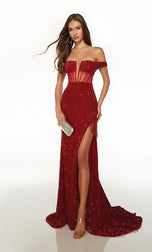 Look no further, Terry Costa has you covered with the best of 2024! This Alyce Paris gown, 61483, showcases an elegant off-shoulder neckline on exposed corset top and decorated with blinding sequins. The fitted skirt is decorated with matching sequins that will have you shinning from every angle, sexy slit to show off your sexy legs, and sweep train!