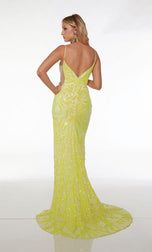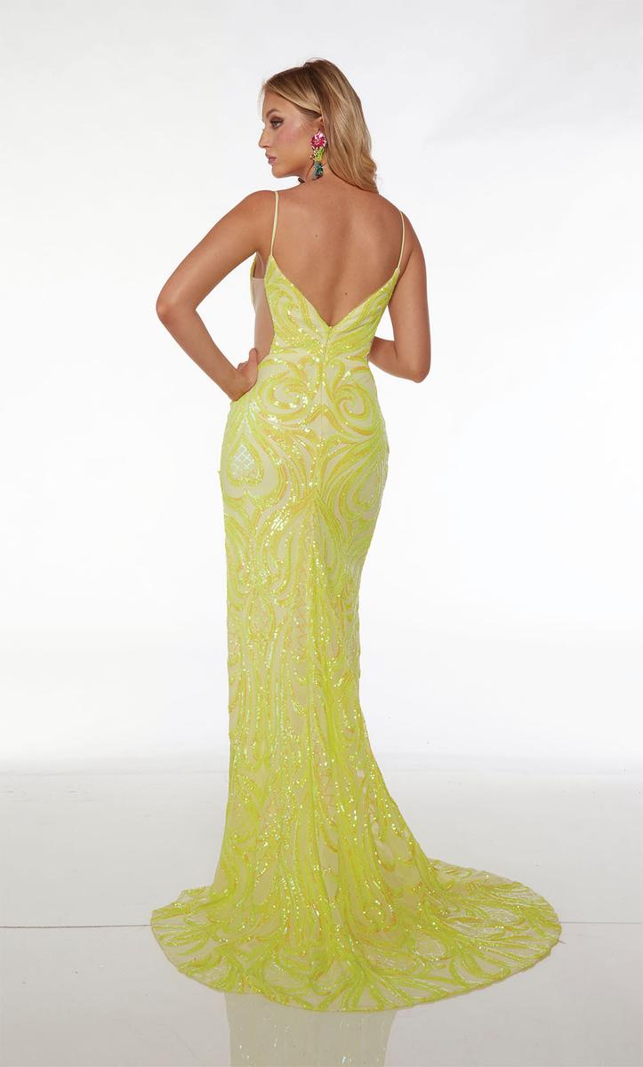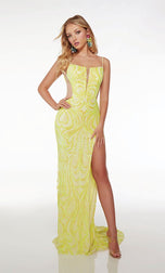 61552, is a captivating prom dress created by Alyce Paris from Spring 2024 Collection. This lemon drop color will have you standing out from the crowd! A plunged neckline with spaghetti straps, side cutouts, and zipper back. The slim fitting gown is beautifully decorated with dazzling sequins and is completed with a sexy thigh-high leg slit.