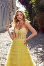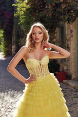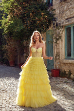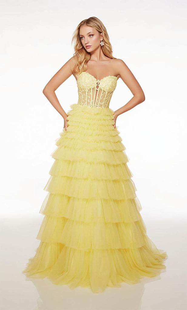 Feel like Belle in this beautiful light yellow ballgown an Alyce Paris masterpiece. 61553, has a striking sheer corset top with strapless sweetheart neckline and delicate lace detail. The ruffled Aline skirt is made from soft tulle and is finished off with an elegant sweep train. This is the perfect choice for HoCo parade to intimate sweet 16!