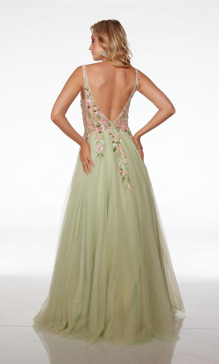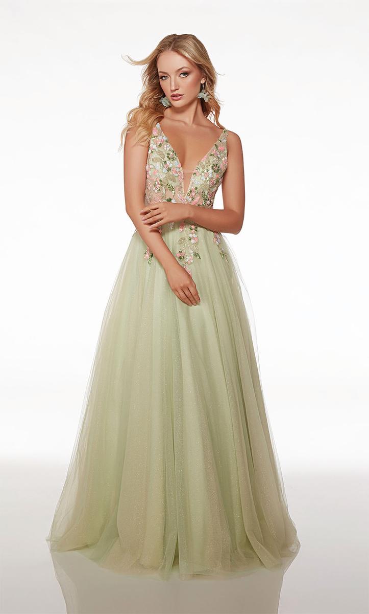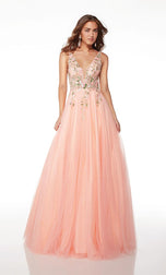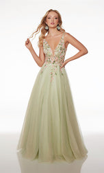 Twirl the night away in this romantic Aline prom dress by Alyce Paris. 61559, has a plunged neckline with thick supportive straps and low v back with zipper closure. The sheer top has beautiful floral lace detail that flow onto the skirt. A full tulle skirt that will flow effortlessly with every step that you take! Don't skip out on this gem for Prom!