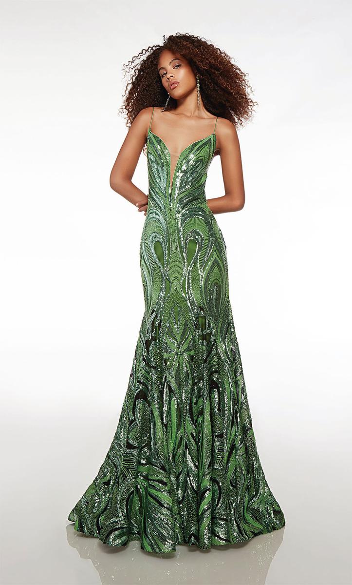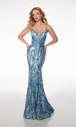 Feel like you're on top of the world in this one-of-a-kind Alyce Paris prom dress, style 61564. This Spring 2024 Collection has all the trendy details from the fun sequin pattern to the eye-catching train. The slim fitting gown has a corset back and plunge neckline with dainty straps. Suitable for any social event!
