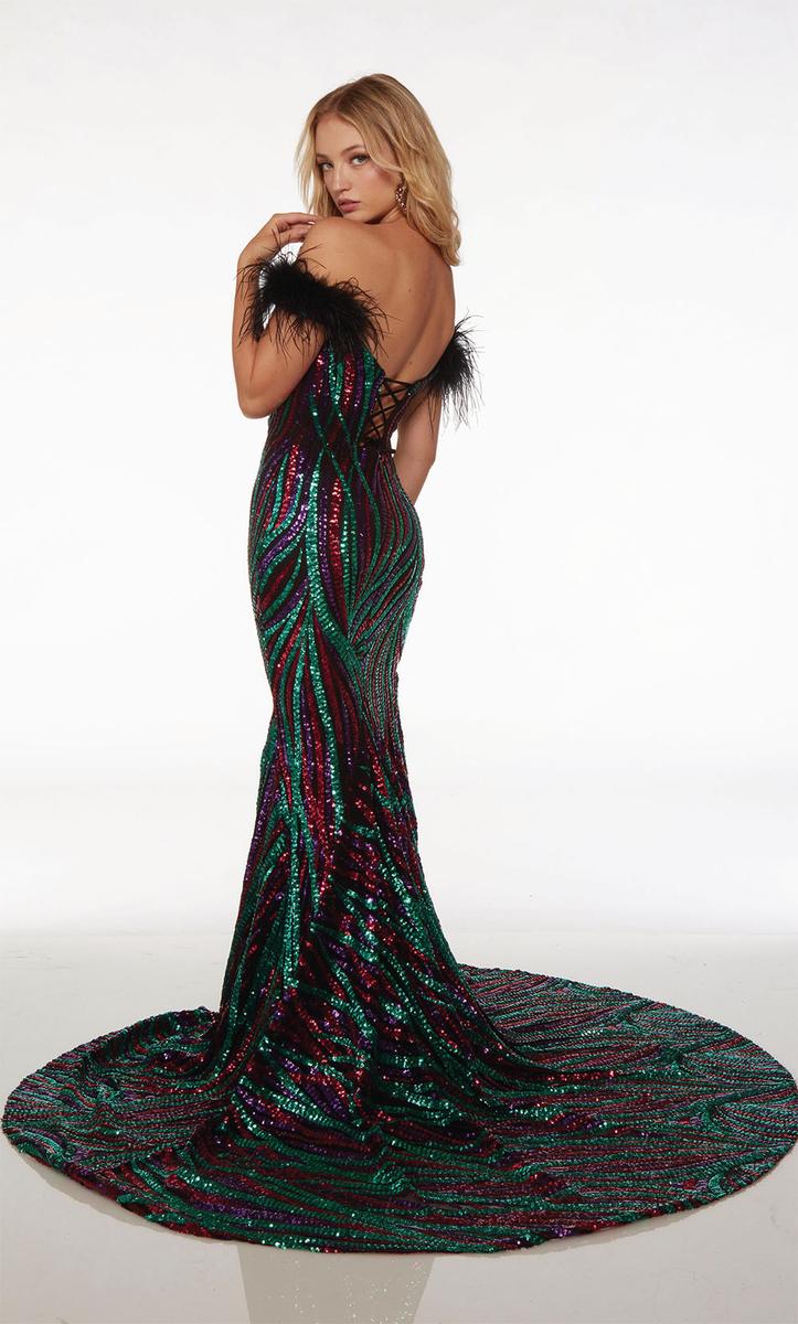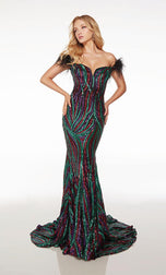 61582 will show off your sexy curves and shine like never before in this stunning mermaid gown created by Alyce Paris from Spring 2024. 61582, has a classy off-shoulder neckline with plunge and feathers along the cap sleeves. The slim fitting gown will give you the hourglass look and is embellished with gorgeous rows of colorful sequins that run from top to bottom. Perfect attire for Black-tie, Gala, Prom and so much more!
