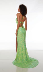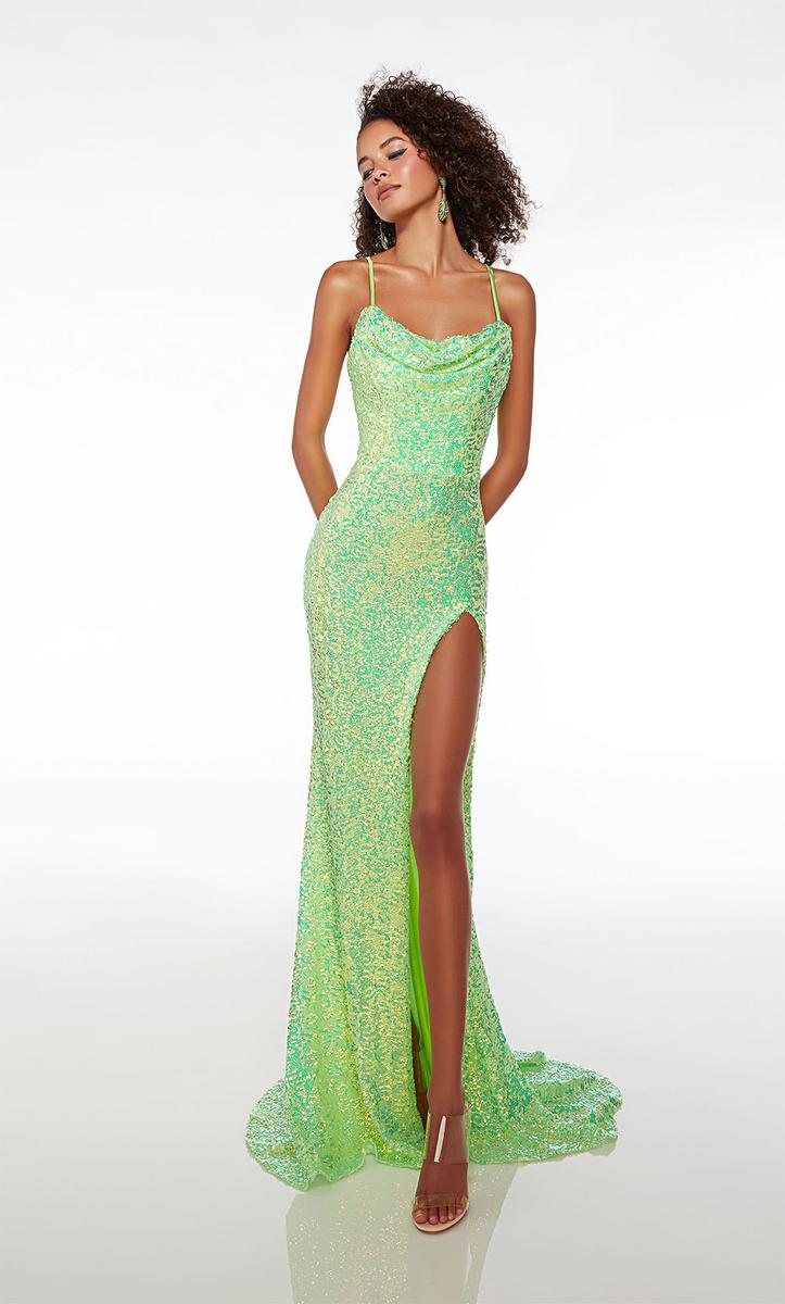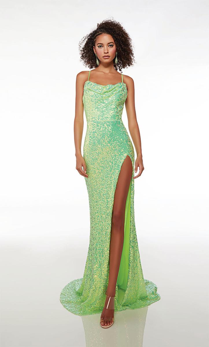 Be prepared to receive all the compliments when you step foot into prom with this stunning Alyce Paris. 61588, is created in rich and vibrant colors, like Electric Lime from picture above. The fitted gown has dazzling sequins that will have you shining like never before. A modest scoop neckline with thin straps and strappy back.