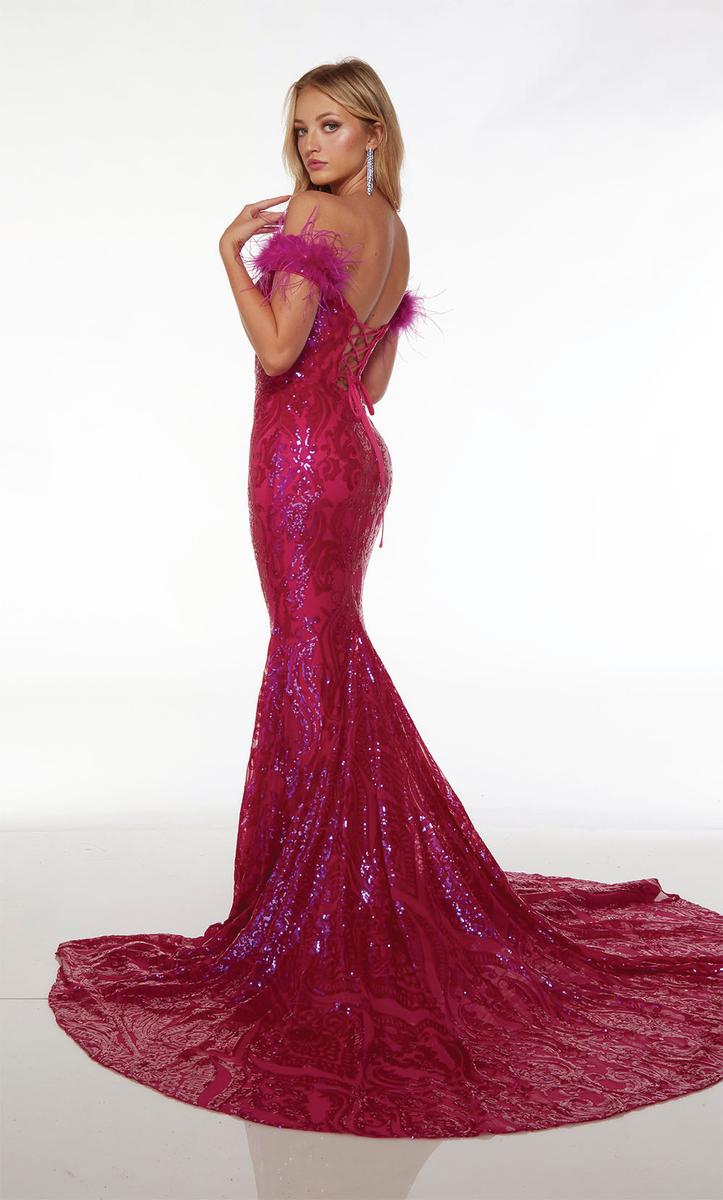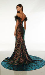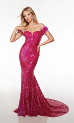 Show off your figure in this mermaid gown created by Alyce Paris from Spring 2024 Collection. 61595, has an elegant off-shoulder neckline and lace-up back for a snatched waist! The gown is adorned with sequin patterns and complimented with feathered cap sleeves. This is one you don't want to miss out on!