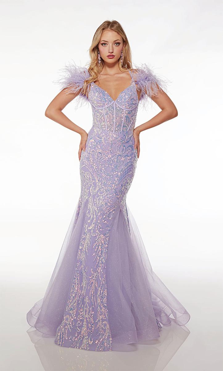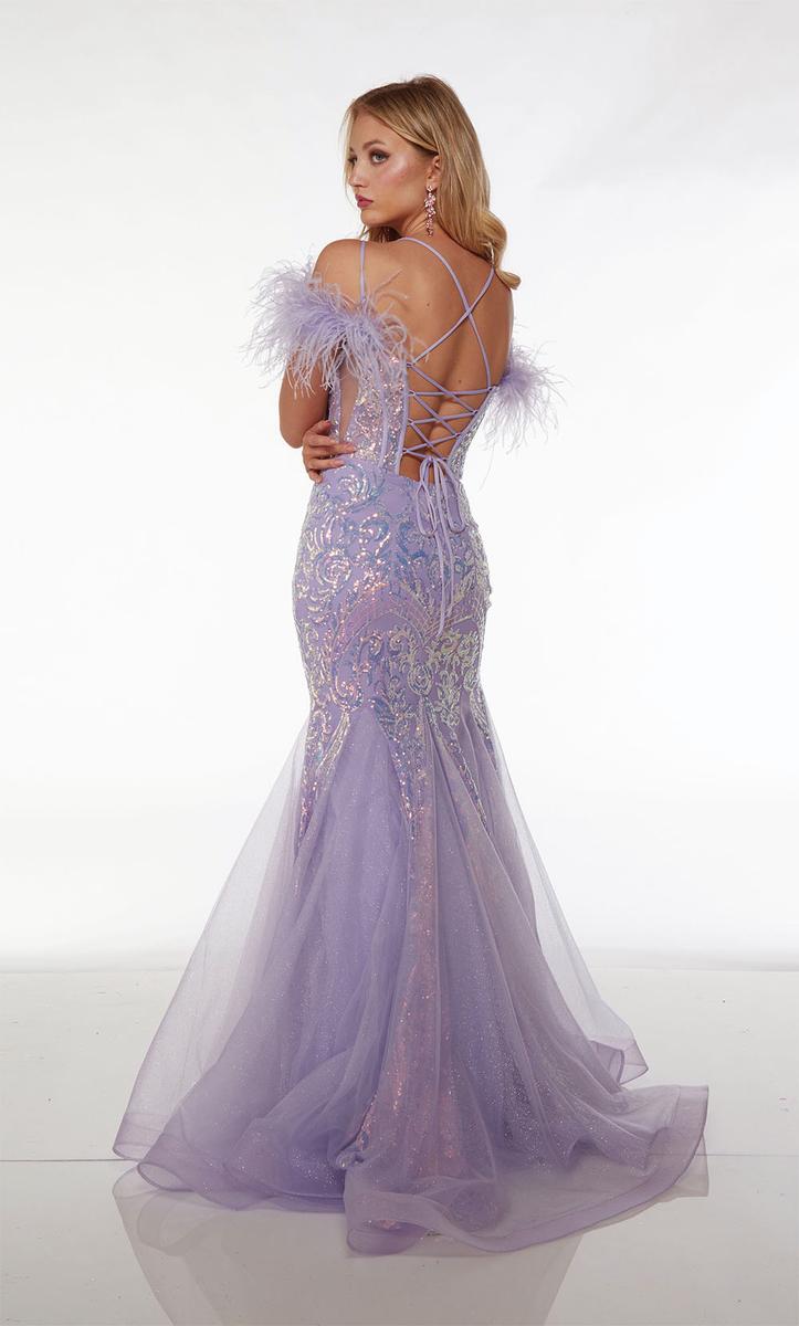 Alyce Paris' 61653 isn't just a prom dress, it's a whispered promise of glamour and intrigue. An illusion corset dances with lace, casting mesmerizing shadows that chase your every move. A lace-up back turns heads like a runway-worthy statement, while wispy feathers frame your face like a delicate halo. The fit and flare silhouette twirls like a modern-day fairytale, leaving a trail of elegance and whispers of "queen of the night." Own your confidence, own your mystery, own the night.
