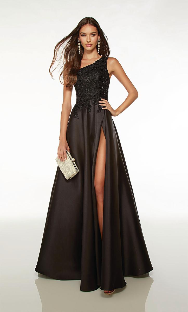 Turn heads at prom or any formal event in Alyce Paris' stunning style 61700, an elegant A-line gown with a one-shoulder silhouette and high side slit. The gorgeous lace applique bodice adds a touch of timeless glamour, while the asymmetrical back cut-outs and high slit exude modern sophistication. This dress is perfect for showcasing your confidence and grace, whether you're dancing the night away at prom or making a grand entrance at an evening gala. Alyce Paris style 61700 - where timeless elegance meets modern edge.