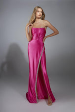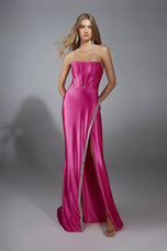 A bold entrance feels guaranteed when you show up in this Alyce Paris long dress that mixes Barbie glam with runway confidence. The stretch satin hugs your curves in the most flattering, fitted way, while the straight strapless neckline keeps everything chic and timeless. That shiny fabric catches the light like youre starring in your own prom night highlight reel, and the sparkly trim along the slit adds just enough shimmer to make the whole look feel magical. It is the kind of dress that makes you want to take a slow walk into the room just so everyone gets the full effect.A mini train trails behind you for that subtle, dramatic moment, and the lace-up back pulls the entire look together with a snatched, sculpted fit. The silhouette is simple but so pretty, proving you do not need a thousand embellishments to look unforgettable. Every detail feels classic in the best way, perfect for girls who want shiny, elegant beauty without doing too much. This dress is timeless, sparkly, and effortlessly stunning, ready to make prom 2026 your prettiest chapter yet.