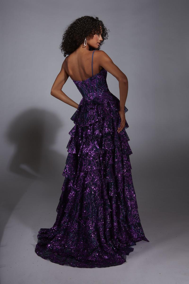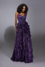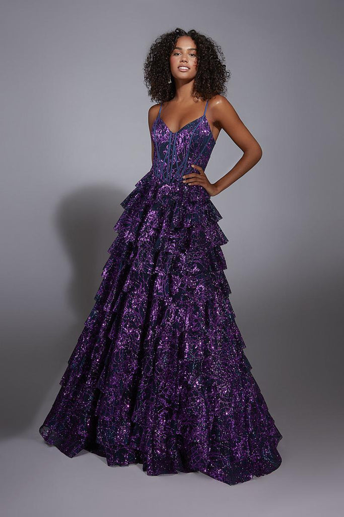 Fairytale glam gets a bold upgrade with this Alyce Paris A-line long dress that looks like it was made for a magical entrance. The glitter tulle fabric shimmers beautifully in motion, and the V-neckline with thin straps adds a soft, pretty touch. Tiered ruffles make the skirt look full, dramatic, and absolutely picture-ready. It is that perfect mix of princess and fashion girl energy that feels right on trend for Prom 2025 without sacrificing that dreamy movie moment vibe.Every layer of sparkle gives this gown a show-stopping glow that will stand out in every photo, hallway spin, and TikTok reveal. The silhouette is feminine and elegant while still giving the kind of personality that makes people instantly look twice. If your prom mood board is all about feeling enchanting, sparkly, confident, and extra in the best way, this Alyce Paris gown is definitely the one. It is princess-coded, glam, and made for your unforgettable night.