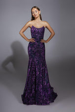 Glittering like a galaxy in motion, this Alyce Paris fit and flare long dress brings instant star power to Prom 2025. The bold sequin pattern shines in every angle of the room, and the strapless boat neckline adds a sleek, elegant touch that feels high fashion. The silhouette hugs just right through the bodice and hips before flaring out into a dramatic train that moves like a movie moment. It is sparkly in a classy, confident way that makes you feel like you belong on a red carpet.Every step becomes an entrance with a gown like this because the sparkles catch the light in the most mesmerizing way. The subtle sexy energy comes from the shape and the details, not from being overly revealing, which makes this look even more powerful. If your prom inspiration vision board looks like Vogue meets princess glam, this is the dress that checks every single box. It is glamorous, unforgettable, and absolutely queen coded for your prom night.