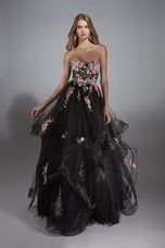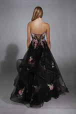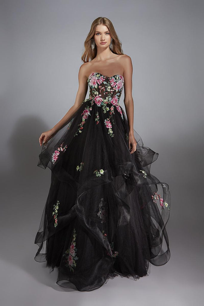 Nothing says garden fairy with a twist quite like an A-line gown covered in floral lace on a bold black base. The strapless sweetheart neckline keeps the top soft and feminine while the corset structure gives that snatched fairytale look everyone loves for Prom 2025. Vertical ruffles float down the skirt in layers that move beautifully, so every step looks dramatic in the cutest way. It is edgy and romantic, mixed, which gives the whole dress a fantasy aesthetic without losing that modern glam vibe.Lace-up back detailing makes the fit comfy and customizable, so you can dance, pose, and hang out all night without worries. The overall look feels like a midnight garden moment that stands out in pictures and in person. Girls who love a unique take on floral will fall in love with how this design blends soft petals with bold fashion energy. It is a long dress that feels dreamy, artsy, and totally unforgettable for prom.
