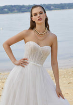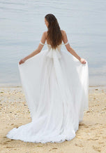 Our Pallas designer wedding dress is a dreamt A-line that all about the textural elements. The bustier bodice features sheer ruching that reveals the couture boning on the airy English net gown. The delicately beaded bow waistline is a feminine detail that leads to bac streamers for more drama. The detachable, draped off-the-shoulders sleeves give you options when styling. Shown in Ivory/Champagne/Honey.