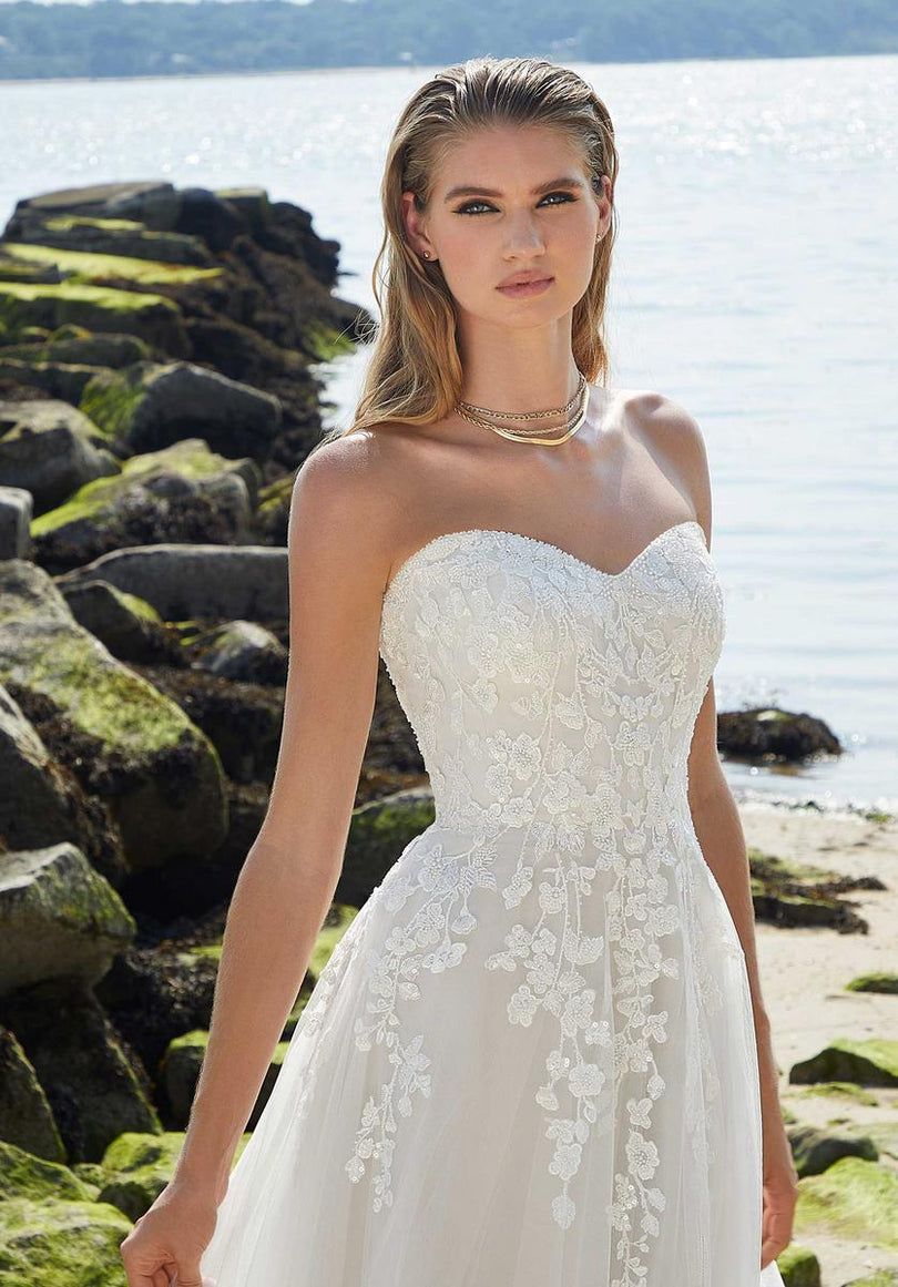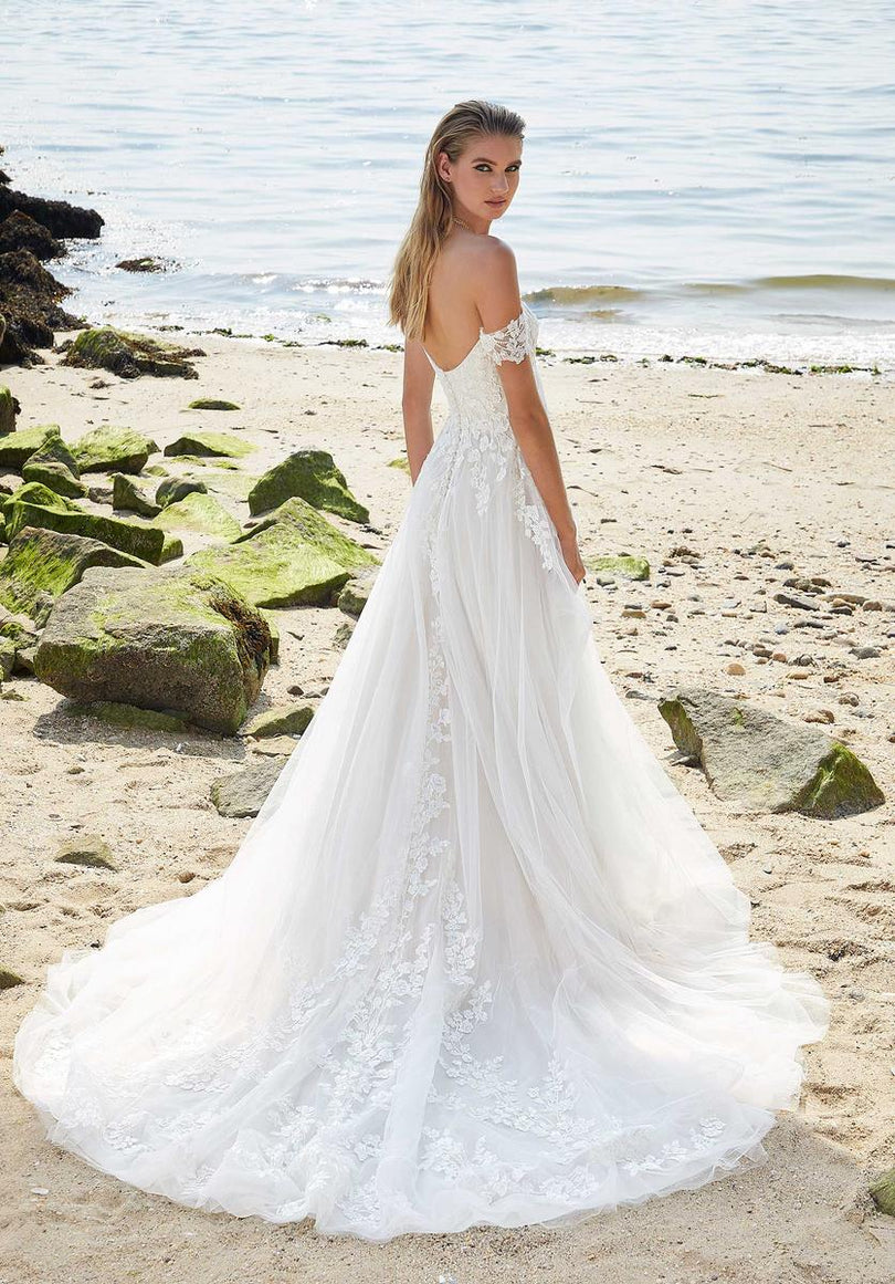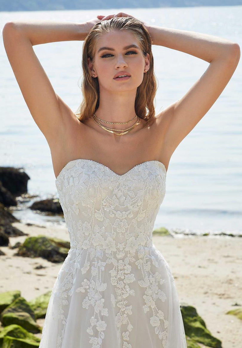 Our Posey designer wedding dress is a feminine and effortless A-line with delicately beaded, floral embroidered lace cascading down from the romantic sweetheart bodice. The dreamy tulle beautifully billows off the body leading to a romantic lace trimmed train. The front skirt slit adds a sultry pop of leg and we love the addition of the sheer, detachable off-the-shoulder sleeves. Shown in Ivory/Champagne.