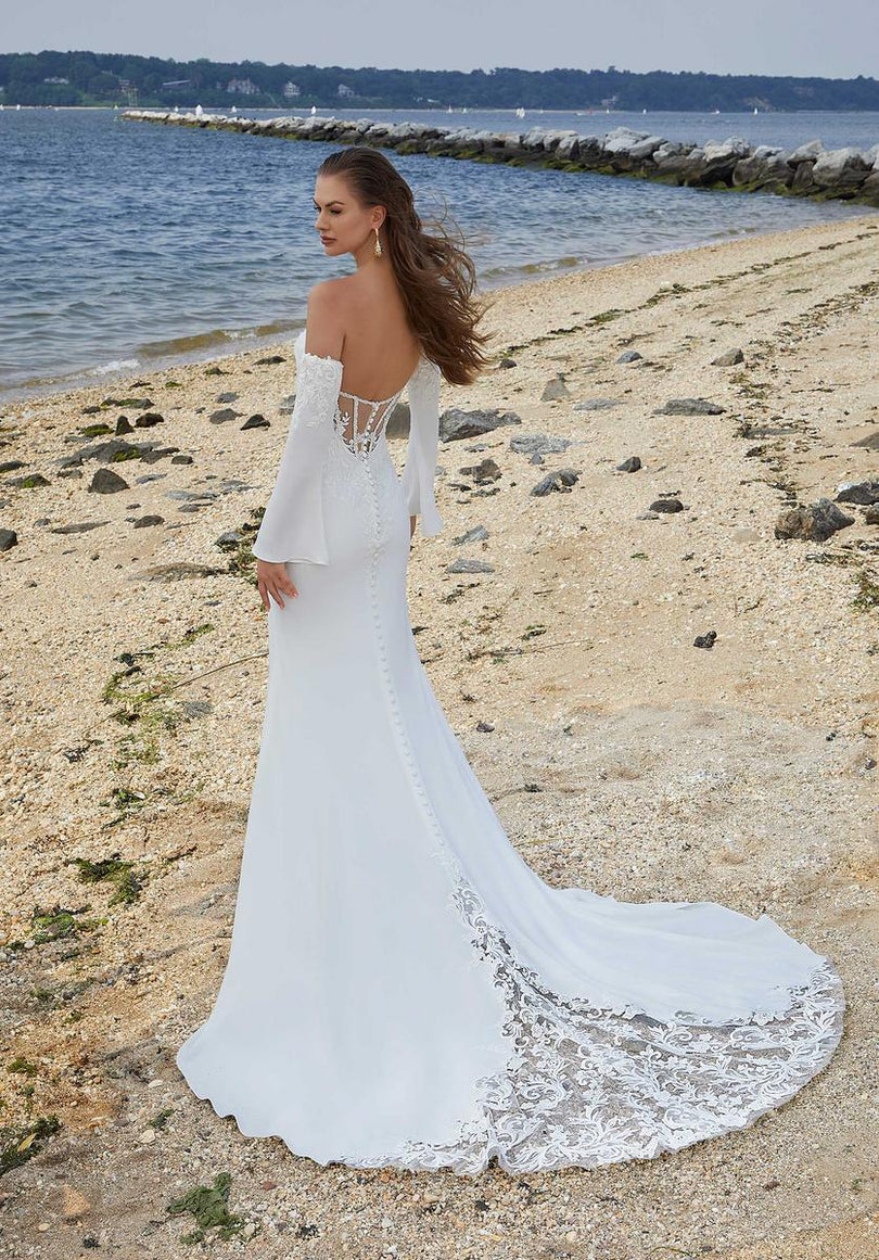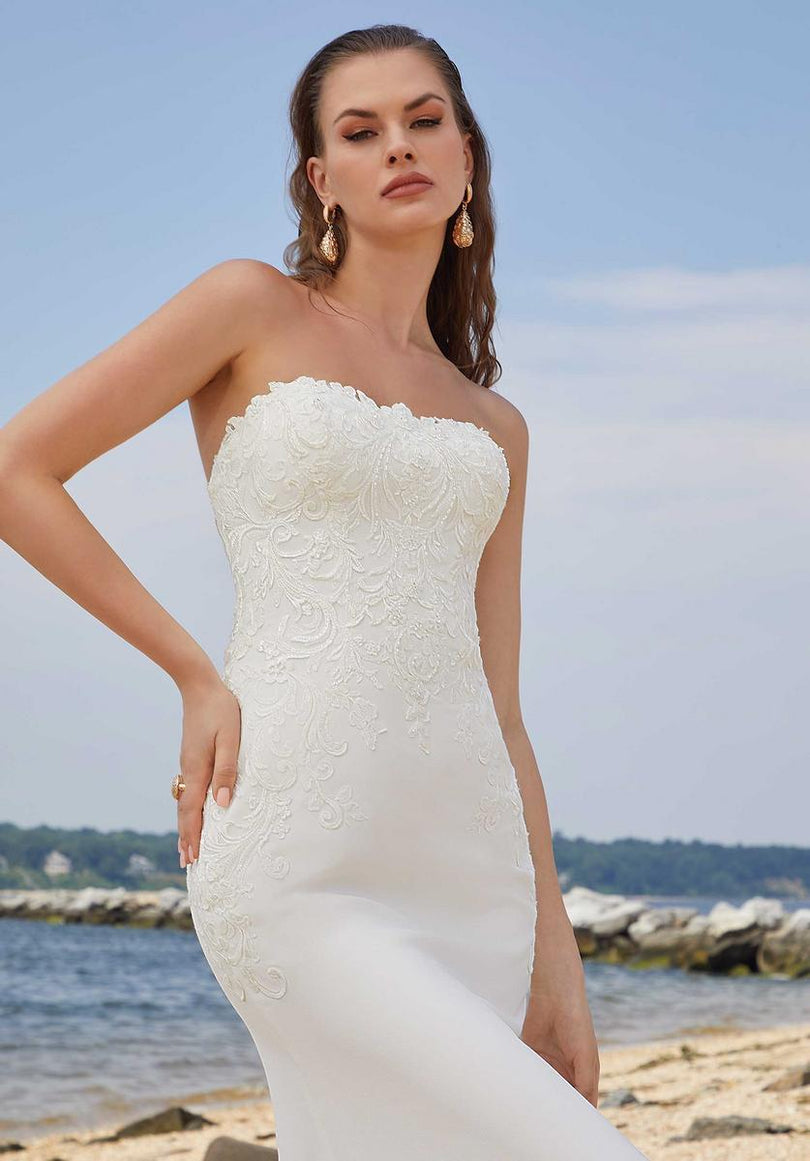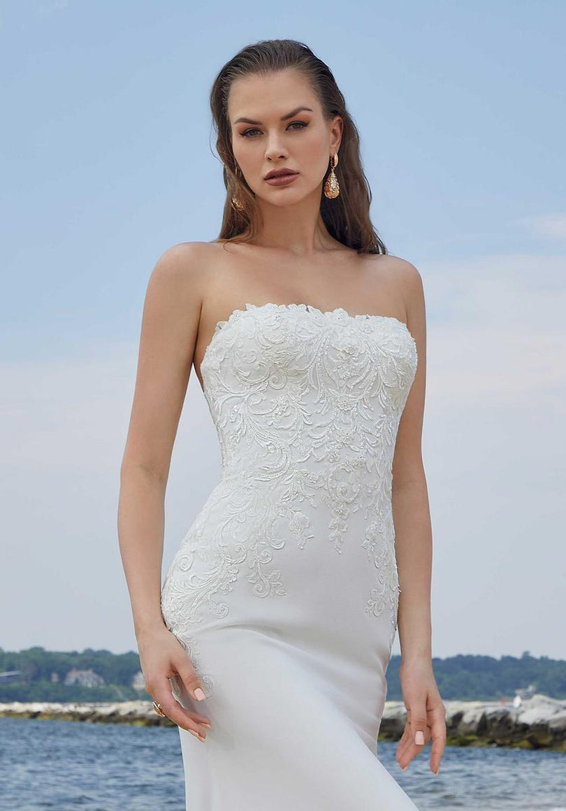 Swirling crystal beaded, frosted embroidery has an elegant embossed effect on our Pura designer wedding dress. The sophisticated fit and flare has a strapless neckline with a textured edge from the gorgeous appliqus with an illusion back revealing couture boning. The sleek crepe gives the gown a streamlined look, while the cut-away lace train is a romantic touch. Pair the dress with detachable bell sleeves for more of a boho vibe. Shown in Ivory/Honey.