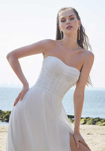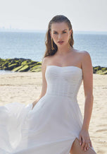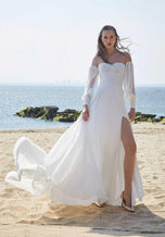 Our Pania designer wedding dress is a billowing boho A-line perfect for our more casual brides. The simple style features a sheer boned bodice with delicate draping for added texture. The flowing skirt has a front slit for more movement, while detachable bishop sleeves add to the free-spirited feel. Shown in Ivory.