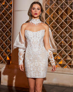 Aisha captivates effortlessly with her shimmering beaded lace, ensuring you shine bright on your special day. Designed for brides seeking to highlight their silhouette, her mini sheath silhouette and strapless design offer a timeless allure. The graceful dip neckline elegantly complements her corset-style bodice, providing both sculptural support and an air of sophistication. For an enchanting touch during the ceremony, Aisha offers a detachable cape adorned with long sleeves and a choker embellished with delicate teardrop pearl details. This exquisite addition transforms her into a true fairy tale masterpiece, ensuring you radiate elegance and charm as you walk down the aisle.