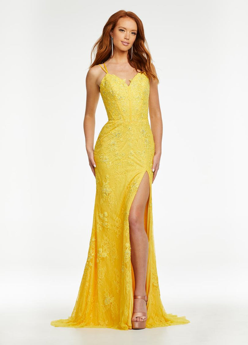 Luscious lace gown featuring lace applique scattered throughout the bodice and skirt. The look is accented by heat press stones and a lace up back.