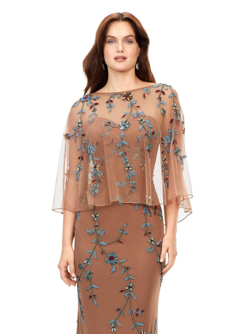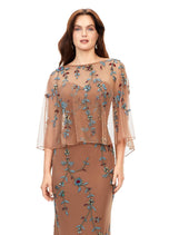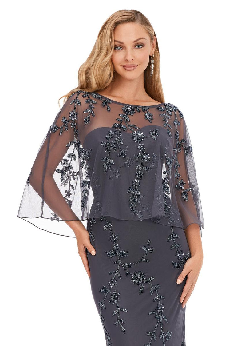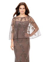 Dazzle in this sophisticated evening gown. This strapless beaded gown is paired with a light detachable overlay. The gown and overlay are adorned wih a floral beaded motif.