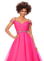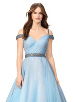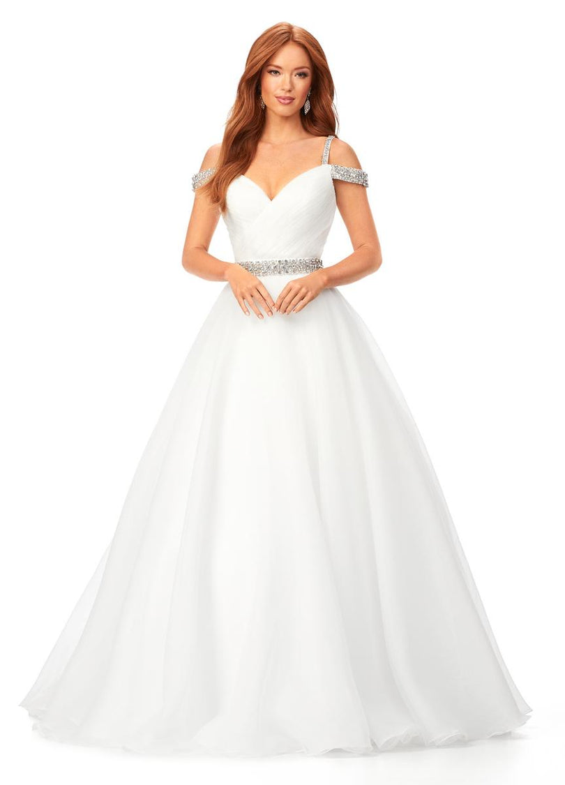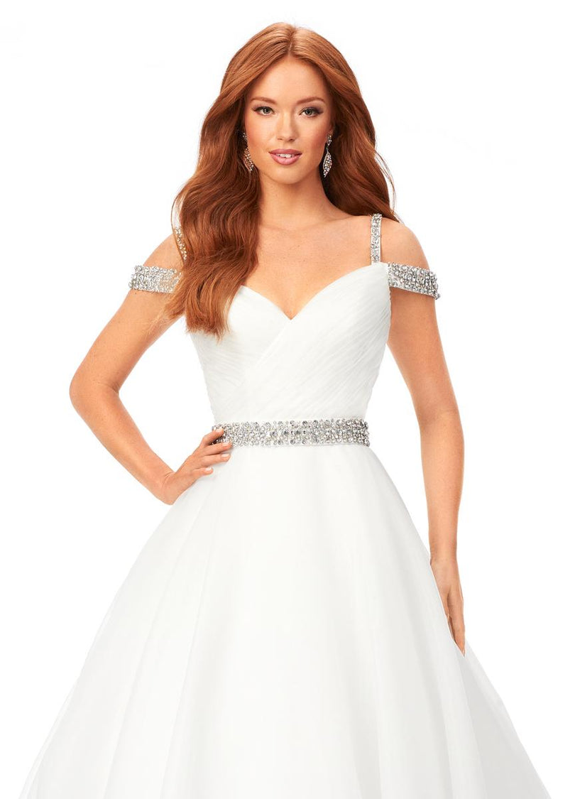 Dazzle in this off shoulder organza ball gown. The wrap bustier is complete with ruching and the spaghetti straps, off shoulder straps and belt are encrusted with rhinestones.