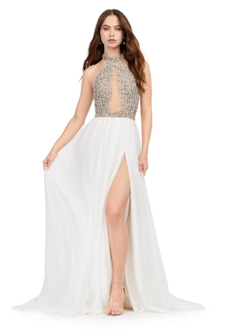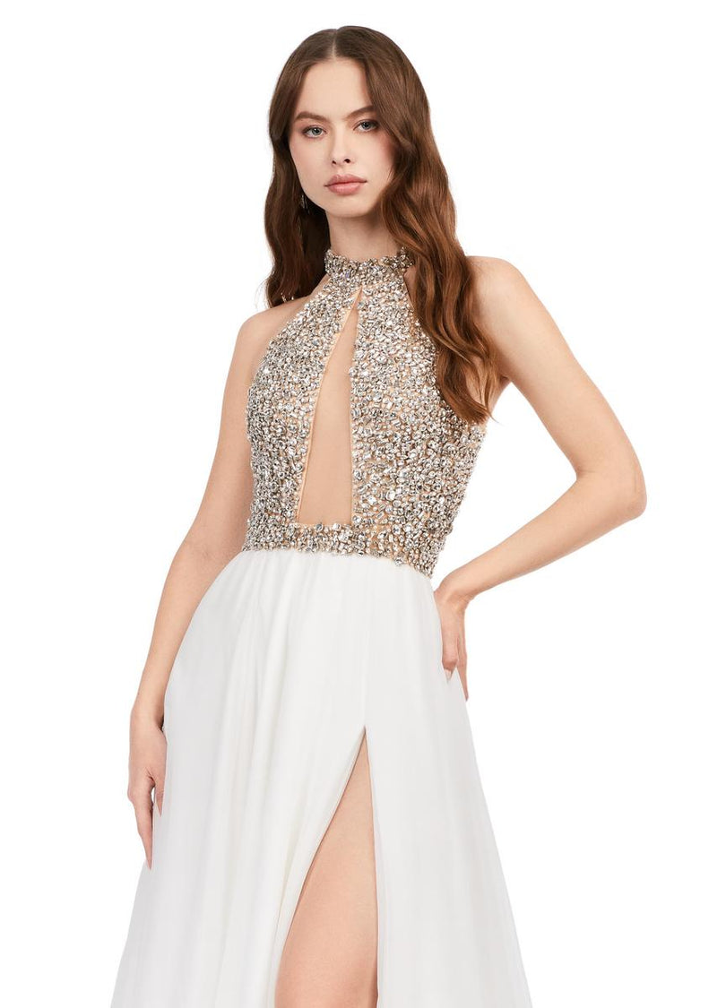 This chiffon A-line gown features a beautifully beaded halter top that is sure to shine bright at any event. The look is complete with an illusion cut out and high left leg slit.