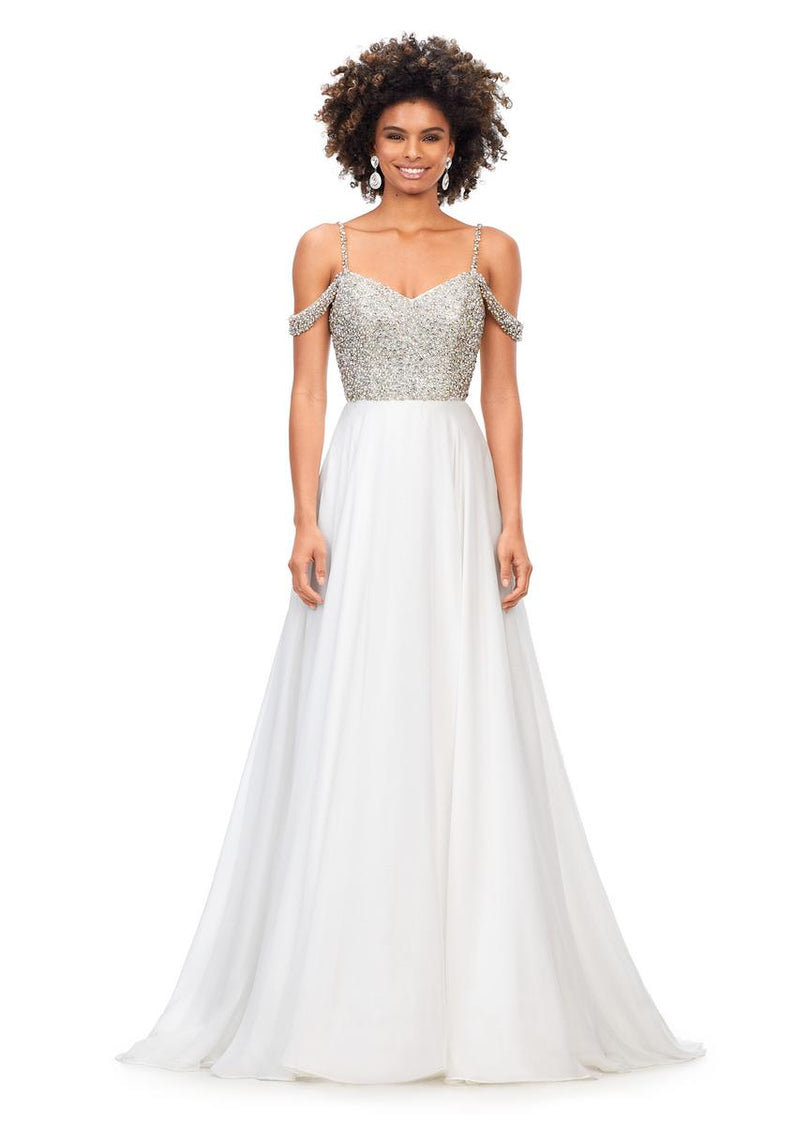 Dazzle in this chiffon a-line gown with a fully encrusted bustier. The bustier, spaghetti straps and shoulder straps are encrusted with crystals and pearls.