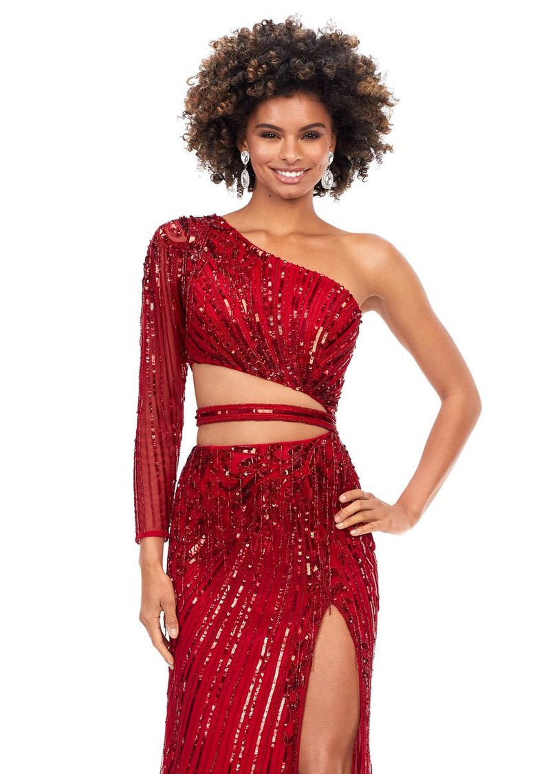 This one shoulder gown has a shark bite cut out at the waist and a left leg slit. The intricate bead pattern is perfectly placed to accentuate your curves. The look is complete with scattered fringe along the shoulder and waistline.