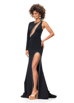 Look like a Hollywood star in this long-fitted jersey gown created by ASHLEYlauren, style 11272. The one-sleeve high neckline is so unique and connects to the side keyhole that flows to the side adorned with beadwork. The fitted gown is completed with a fitted skirt and side slit to show off your sexy legs. This is the perfect choice for any social gathering!