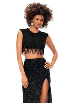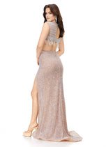 We are obsessed with this roaring twenties inspired gown! This two piece fully sequin gown has an intricate bead pattern that drapes along the bottom of the bustier. The skirt is complete with a left leg slit.