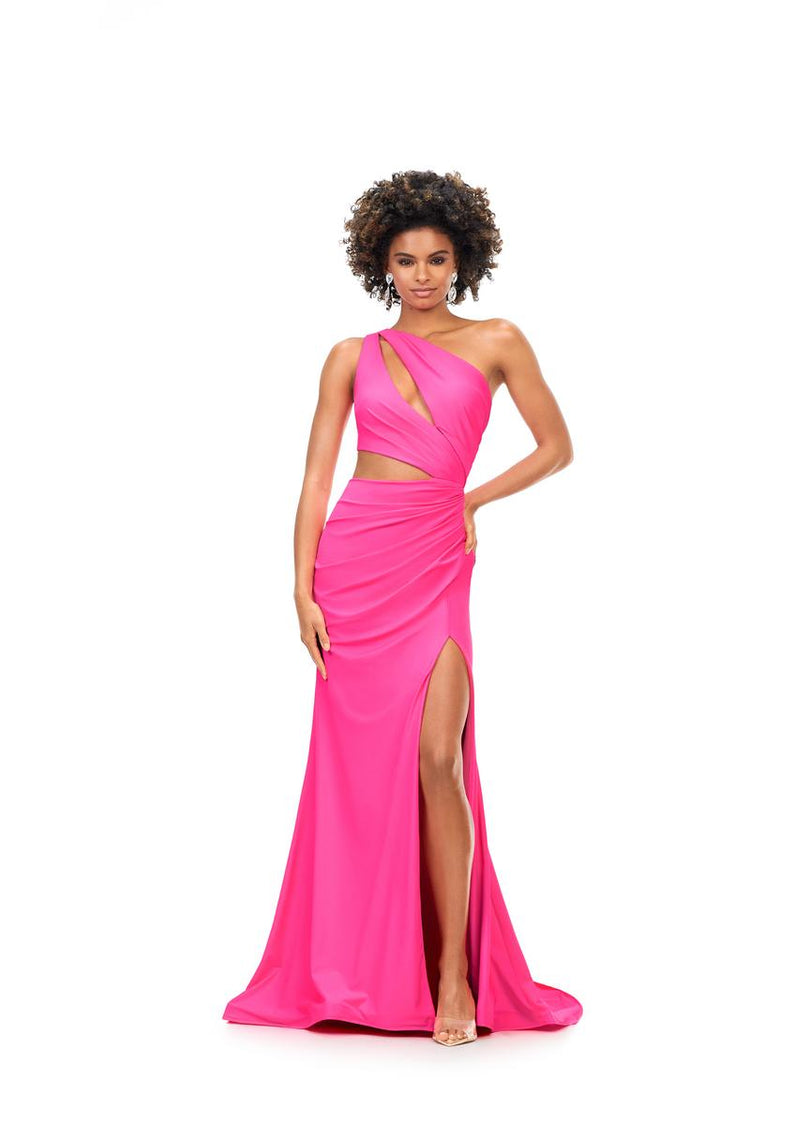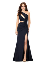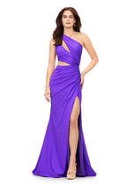 This one shoulder jersey gown features a ruched bodice with asymmetrical cut outs. The ruching continues onto the fitted skirt with slit. The look is complete with an exposed metal zipper back.