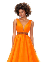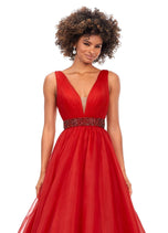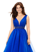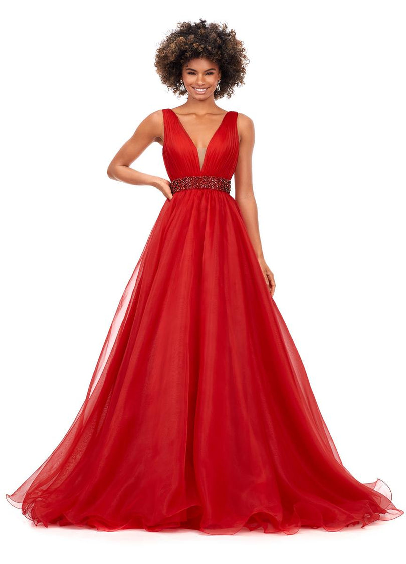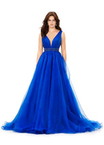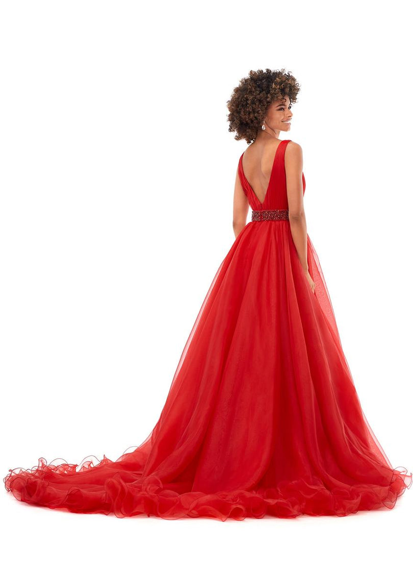 Stand out in this ball gown complete with a crystal encrusted waistband. The bustier has a deep v-neckline and a v-back. The gown is finished with a long, lavish train.