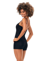 This spaghetti strap lace romper features lace applique thoroughout. The applique is adorned with heat set stones adding the perfect amount of sparkle. The detachable chiffon skirt completes the look.