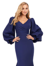 With class and elegance, this beautiful evening gown is sure to stun. This fitted gown features an elegant draped v-neckline. The look is accented with bishop sleeves and a sweep train.