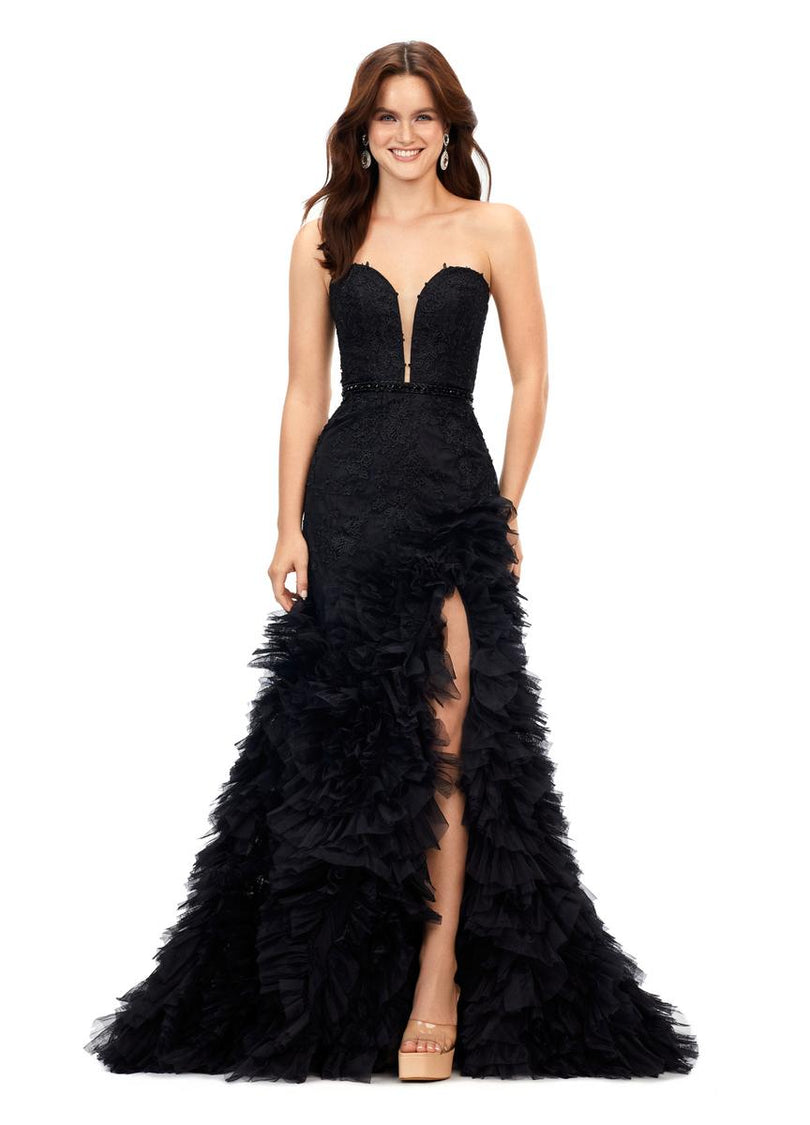 This luscious lace gown features lace applique scattered throughout the bodice, along with an embellished waistband. With its ruffle tulle skirt & sunken v-neckline, you are sure to turn heads!