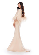 Make an entrance in this phantom satin fit and flare gown with flare sleeves. The modern scoop neckline and sleeves trimmed in feathers are sure to stand out. The skirt is finished with horsehair.
