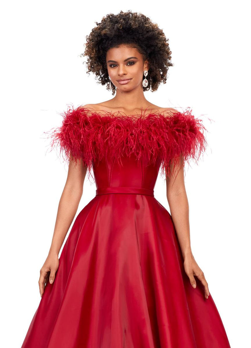 This elegant off shoulder gown features a pop of feathers around the neckline. The look is complete with a ball gown skirt.