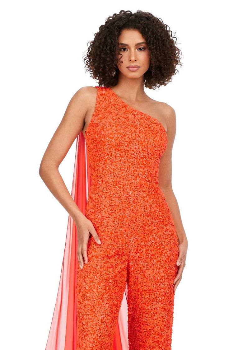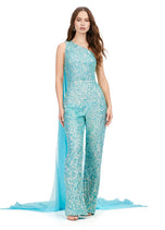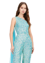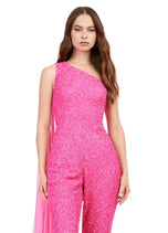 Fall in love with this eye catching sequin jumpsuit! The one shoulder neckline is complete with a removable cape. The open back is adorned with sequin straps.