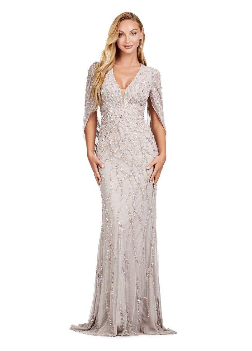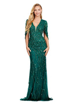 This high fashion design is sure to be perfect for your next event. The fully beaded design features cape sleeves and a V-Neckline adding the perfect amount of drama to this elegant look.