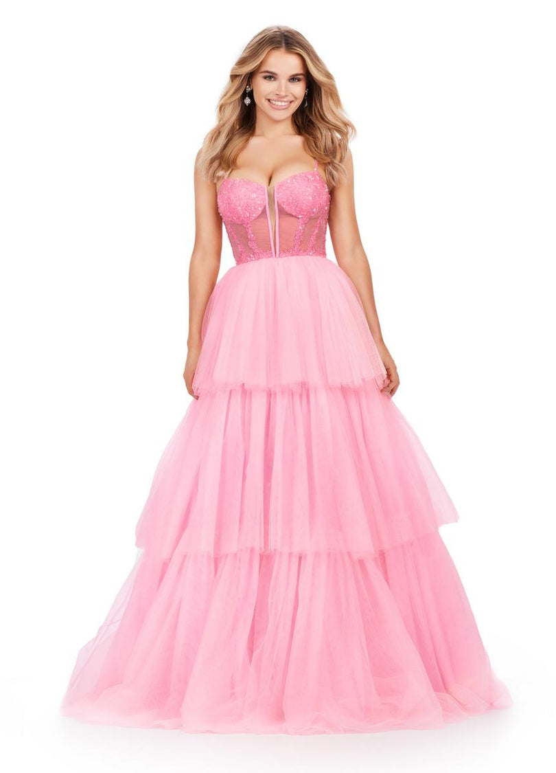 The perfect dress does exist! This tiered tulle ball gown features a sheer beaded bustier complete with spaghetti straps. The tiered ruffle skirt completes the look.