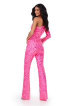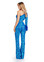 The most perfect jumpsuit! This one shoulder stretch sequin jumpsuit features a fabulous feather cuff and side waist cut out.